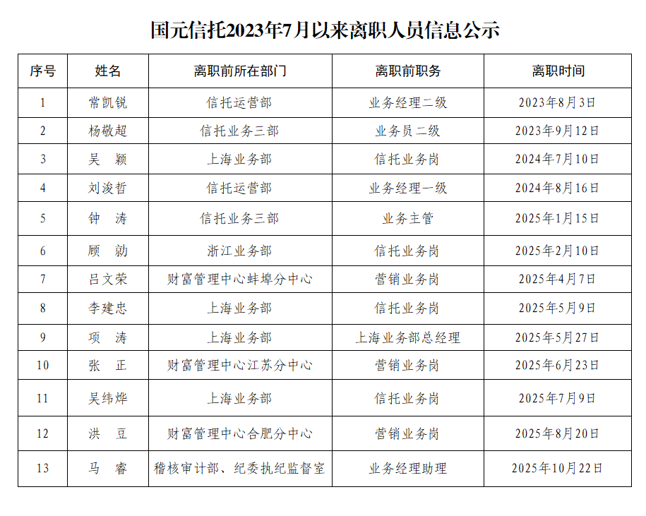 国元信托2023年7月以来离职人员信息公示
